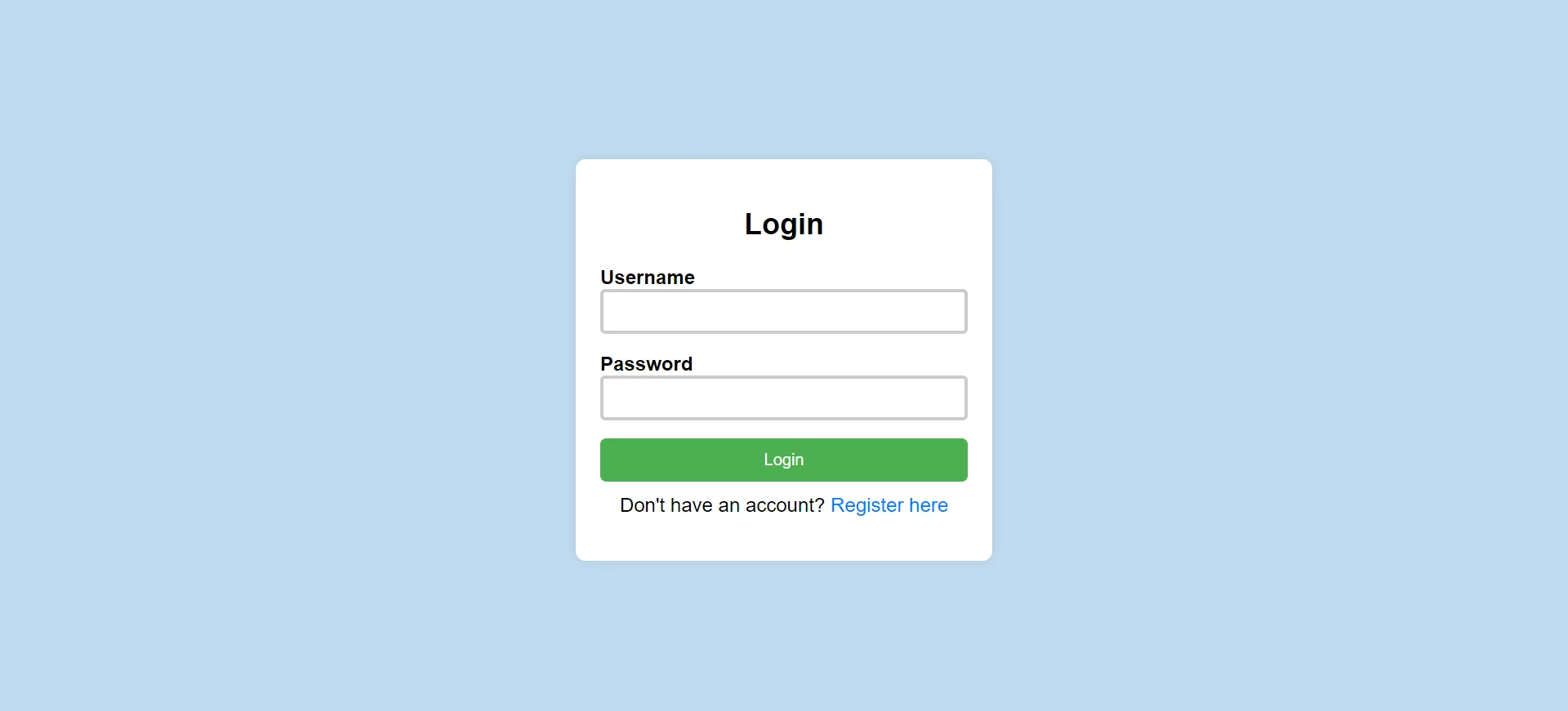 <!DOCTYPE html> <html lang="en"> <head> <meta charset="UTF-8"> <meta name="viewport" content="width=device-width, initial-scale=1.0"> <title>Login Page</title> <style type="text/css"> body { font-family: Arial, sans-serif; background-color: #C0DBF0 ; display: flex; justify-content: center; align-items: center; height: 100vh; margin: 0; } .login-container { background-color: #fff; padding: 20px; border-radius: 8px; box-shadow: 0 0 10px rgba(0, 0, 0, 0.1); width: 300px; } .login-form { display: flex; flex-direction: column; } .login-form h2 { text-align: center; margin-bottom: 20px; } .form-group { margin-bottom: 15px; } .form-group label { font-weight: bold; } .form-group input { padding: 8px; width: 100%; box-sizing: border-box; border: 1px solid #ccc; border-radius: 4px; } button { padding: 10px; background-color: #4CAF50; color: white; border: none; cursor: pointer; border-radius: 4px; } button:hover { background-color: #45a049; } .register-link { text-align: center; margin-top: 10px; } .register-link a { color: #007bff; text-decoration: none; } .register-link a:hover { text-decoration: underline; } </style> </head> <body> <div class="login-container"> <form action="#" method="POST" class="login-form"> <h2>Login</h2> <div class="form-group"> <label for="username">Username</label> <input type="text" id="username" name="username" required> </div> <div class="form-group"> <label for="password">Password</label> <input type="password" id="password" name="password" required> </div> <button type="submit">Login</button> <p class="register-link">Don't have an account? <a href="#">Register here</a></p> </form> </div> </body> </html>
